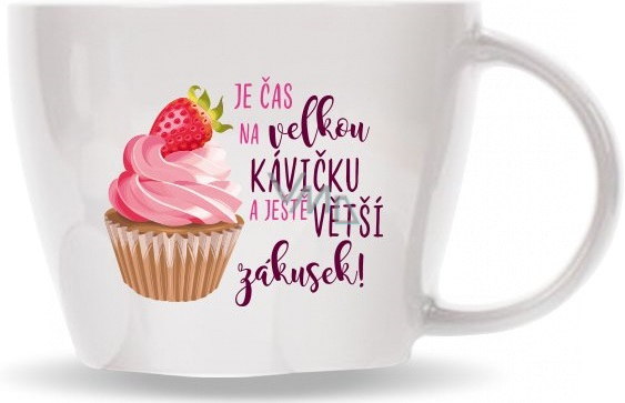Pořádný hrnek pro opravdu dlouhou pauzu! Není nic lepšího, než si do něj uvařit svůj oblíbený nápoj a pomalými doušky si jej vychutnávat. Jen tak si můžete skutečně odpočinout. Text na hrnku "Je čas na velkou kávičku a ještě větší zákusek" ocení každá dívka, či žena.