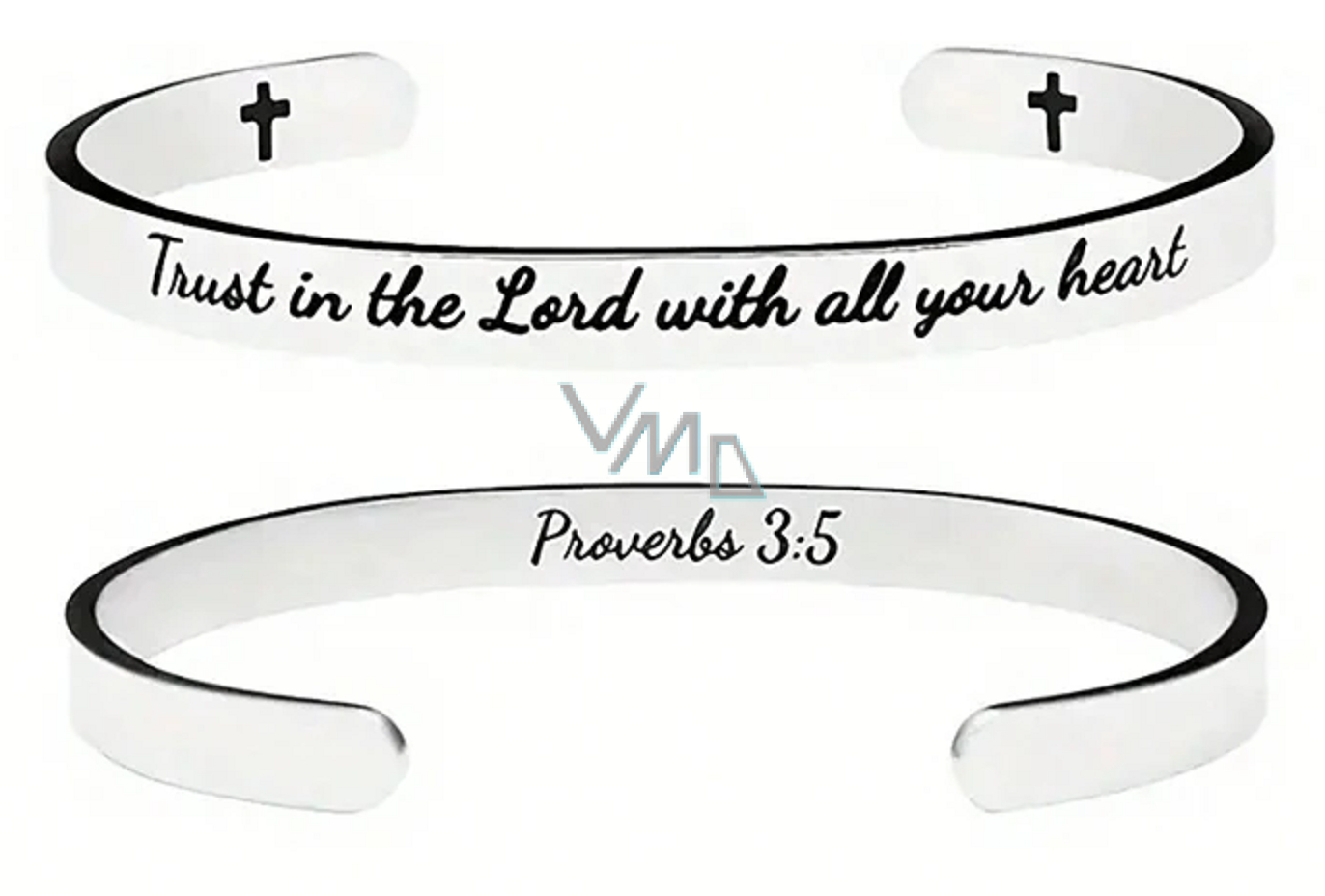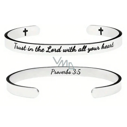 Nierdzewna stalowa bransoletka srebrna z grawerowaniem Wierzę w Boga..., otwarta mankiet, 6 mm