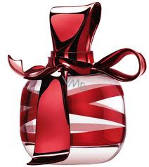 Flakon: Láhev je zdobena barevnými červenými stuhami.