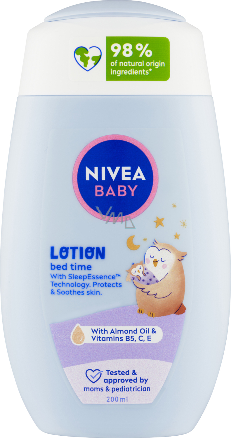 Mleczko do ciała Nivea® Baby Bed Time odżywia, uspokaja i chroni delikatną skórę dziecka. Skład z technologią SleepEssence™ pomaga wprowadzić kojące uczucie przed snem. Wegetariańskie i biologicznie rozkładalne składniki bez mikroplastików i parabenów. Z 100% naturalnym olejem migdałowym oraz witaminami B5, C i E.