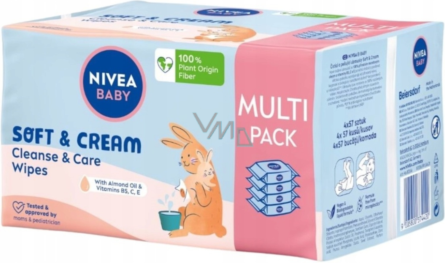 Nivea Baby Soft & Cream nawilżane chusteczki zapewniają delikatną i skuteczną pielęgnację wrażliwej skóry dzieci. Dzięki zawartości kremu z naturalnym olejem migdałowym i witaminą E doskonale oczyszczają, nawilżają i chronią skórę przed podrażnieniami. Chusteczki są hipoalergiczne, dermatologicznie testowane i odpowiednie nawet dla najmniejszych dzieci. Praktyczne opakowanie 4 × 57 szt. zapewnia, że będą zawsze pod ręką w domu i w podróży.