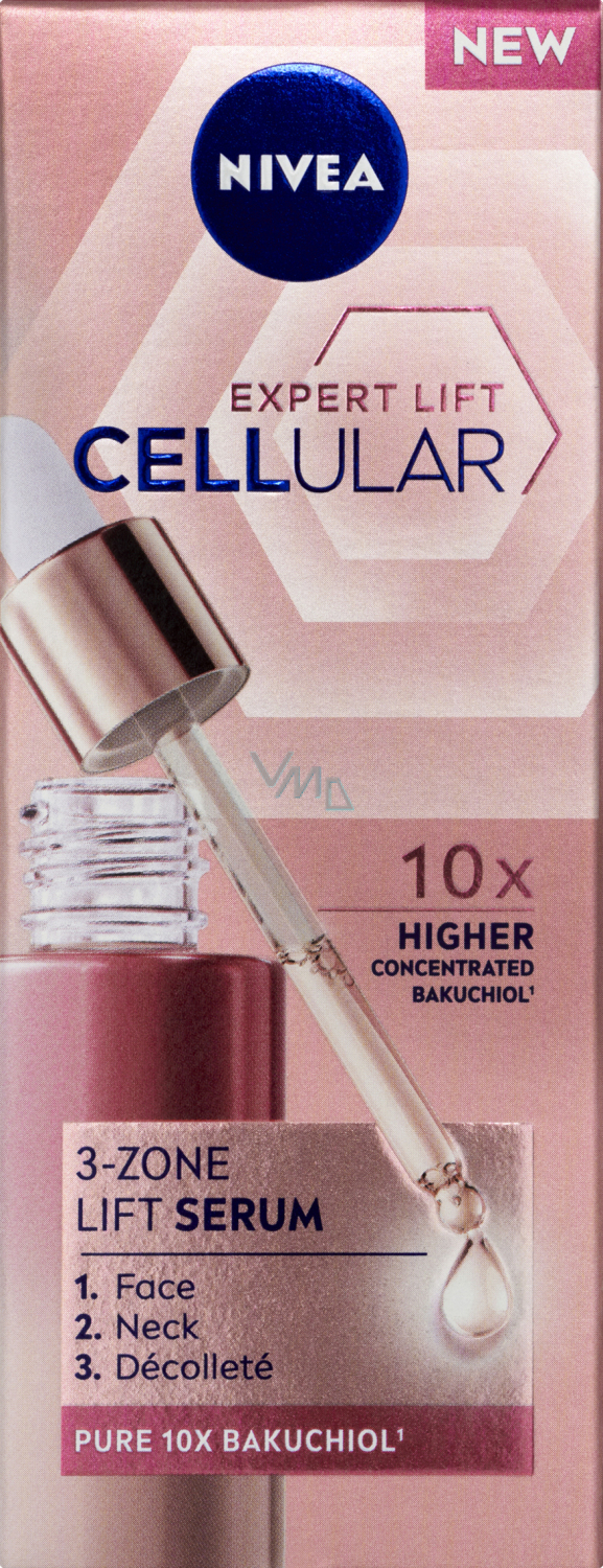 Nauka o młodo wyglądającej skórze. Nivea® Serum Cellular Expert Lift. 3-strefowe serum działa głęboko na poziomie komórkowym, zapewniając natychmiastowy efekt liftingujący w obszarze twarzy, szyi i dekoltu. Widocznie redukuje zmarszczki i napina kontury. Zaawansowana formuła z naszym najwyższym stężeniem bakuchiolu: 10x bardziej skoncentrowany czysty bakuchiol¹ wykazuje działanie stymulujące odbudowę komórek skóry i tworzenie dwóch typów własnego kolagenu skóry.²