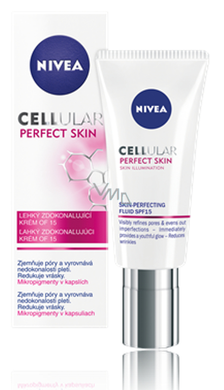Pleťový krém Nivea Fluid Cellular Perfect Skin je lehký zdokonalující krém, který vaši tvář do hloubky hydratuje, nádherně ji rozjasní a sjednotí tón pleti. Speciální enkapsulované pigmenty se perfektně přizpůsobí tónu pleti a okamžitě kryjí veškeré nedokonalosti - rozšířené póry, vrásky i pigmentové skvrny. Již po 4 týdnech pravidelného používání fluid redukuje vrásky a zlepšuje schopnost buněčné obnovy pleti.