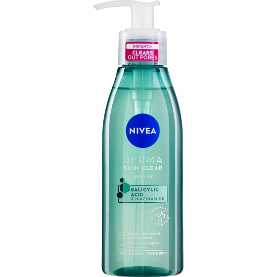 Nivea Żel oczyszczający do twarzy Derma Skin Clear dla skóry skłonnej do niedoskonałości z kwasem salicylowym i niacynamidem dogłębnie oczyszcza skórę i pory oraz usuwa nadmiar sebum. Wegetariańska formuła - nie zawiera składników pochodzenia zwierzęcego.