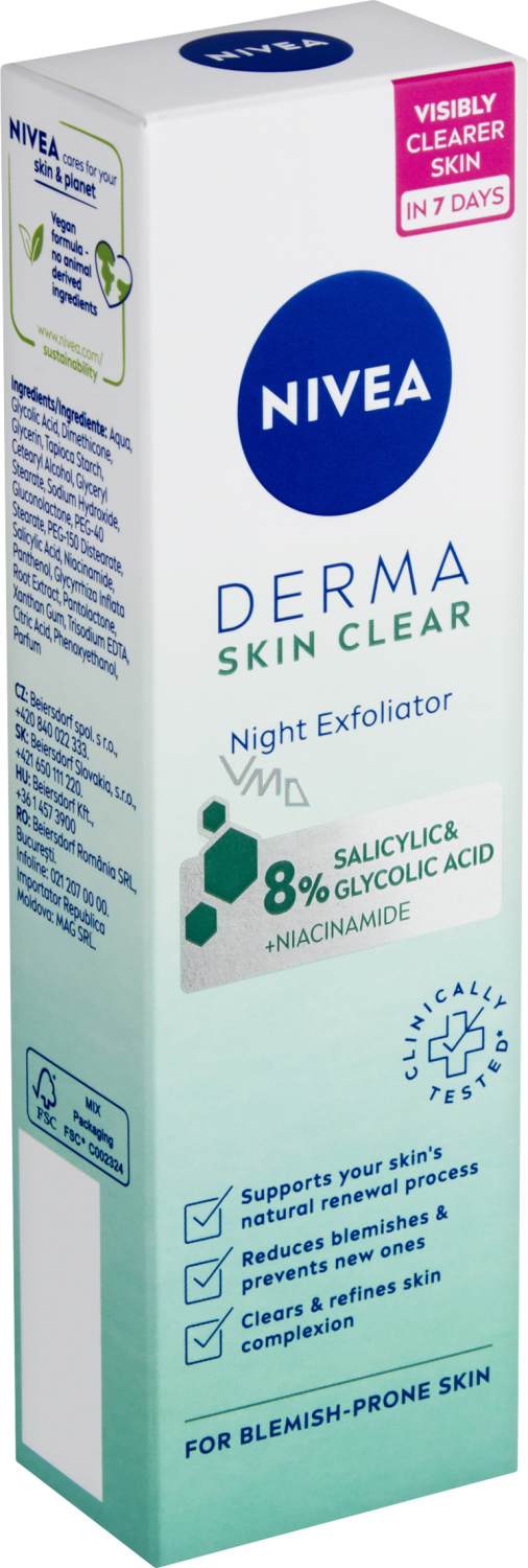 Nivea Peeling na noc Derma Skin Clear wspiera naturalny proces regeneracji skóry. Wysoce skoncentrowana formuła zawiera 8% AHA/BHA (kwas salicylowy & glikolowy) oraz niacynamid. Skład wegański - nie zawiera składników pochodzenia zwierzęcego.