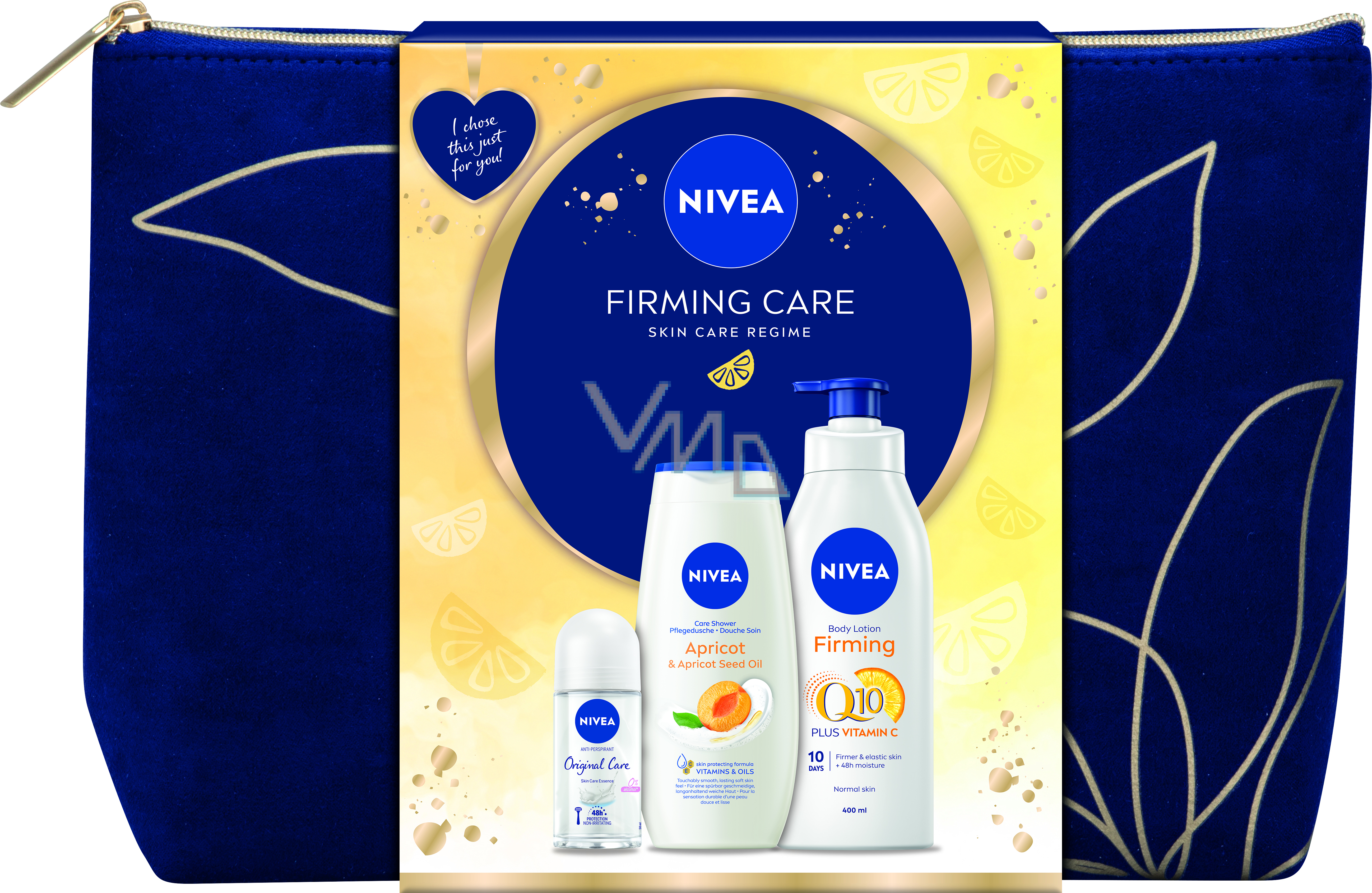 Nivea Firming Care Original Care kuličkový antiperspirant roll-on 50 ml + Apricot & Apricot Seed Oil sprchový gel 250 ml + Firming Q10 + Vitamin C zpevňující tělové mléko 400 ml + kosmetická taška, kosmetická sada pro ženy