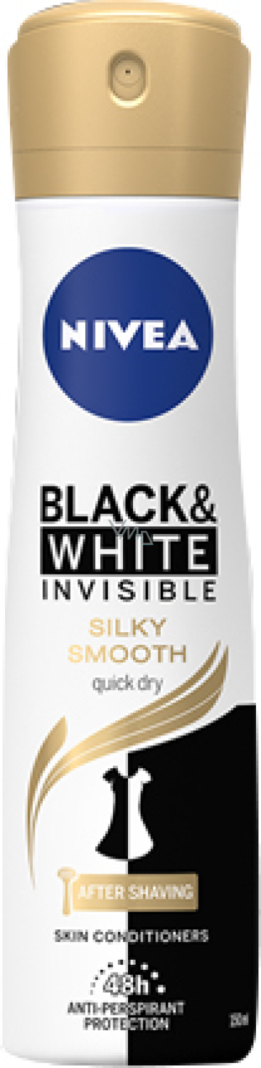 Już więcej podrażnionej skóry pod pachami. Jedwabna skóra pod pachami nawet po goleniu. Dzięki nowej formule, która dba o skórę, możesz swoją ochronę przed potem i zapachem nałożyć natychmiast po goleniu i wyruszyć! Każdy Twój krok będzie towarzyszyć świeżość i uczucie delikatności, które utrzyma się przez całe 48 h. Wybierz rozwiązanie bezalkoholowe, które nie zostawi żadnych śladów na ubraniach i pachnie tak zmysłowo - NIVEA Spray antyperspirant B&W Invisible Silky Smooth.