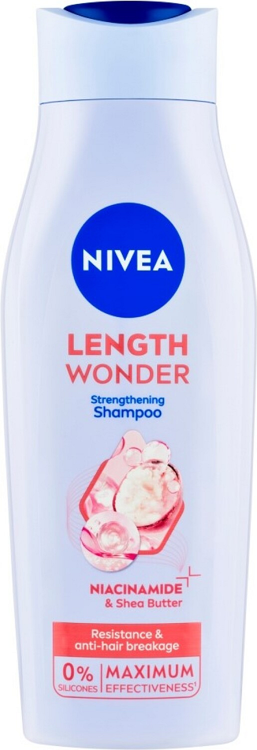Nivea Length Wonder to szampon zaprojektowany, aby włosy odżywiać, wzmacniać i wspierać ich zdrowy wzrost. Zawiera niacynamid (witamina B3) i masło shea, które razem pomagają utrzymać długości włosów bez rozdwojonych końcówek. Włosy po umyciu są widocznie gładkie, lśniące i łatwiejsze do stylizacji. Formuła jest dodatkowo wegańska, bez silikonów i mikroplastików, ma optymalne pH i jest łagodna dla skóry głowy – dlatego jest idealna do codziennego stosowania.