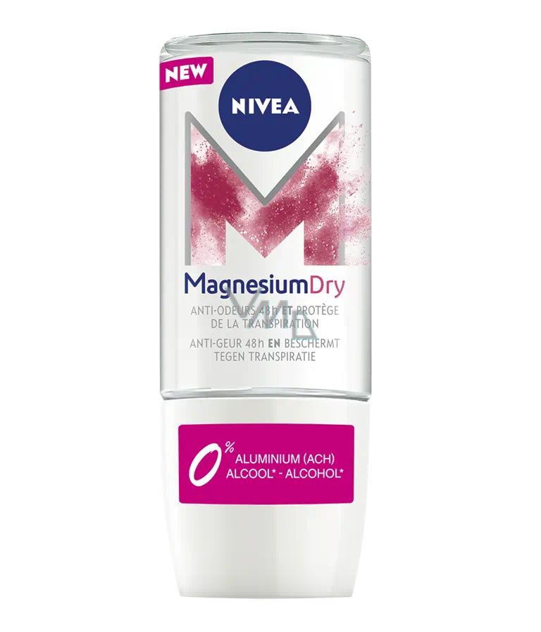 Odkryj nową generację dezodorantu MagnesiumDry od Nivea Pierwszy dezodorant Nivea bez soli aluminium, który chroni zarówno przed zapachem przez 48 godzin, jak i przed poceniem. Jego opatentowana formuła składa się z sól hołdżiku i kwasów tłuszczowych naturalnie występujących w skórze, których sposób działania na pocenie jest podobny do soli aluminium.