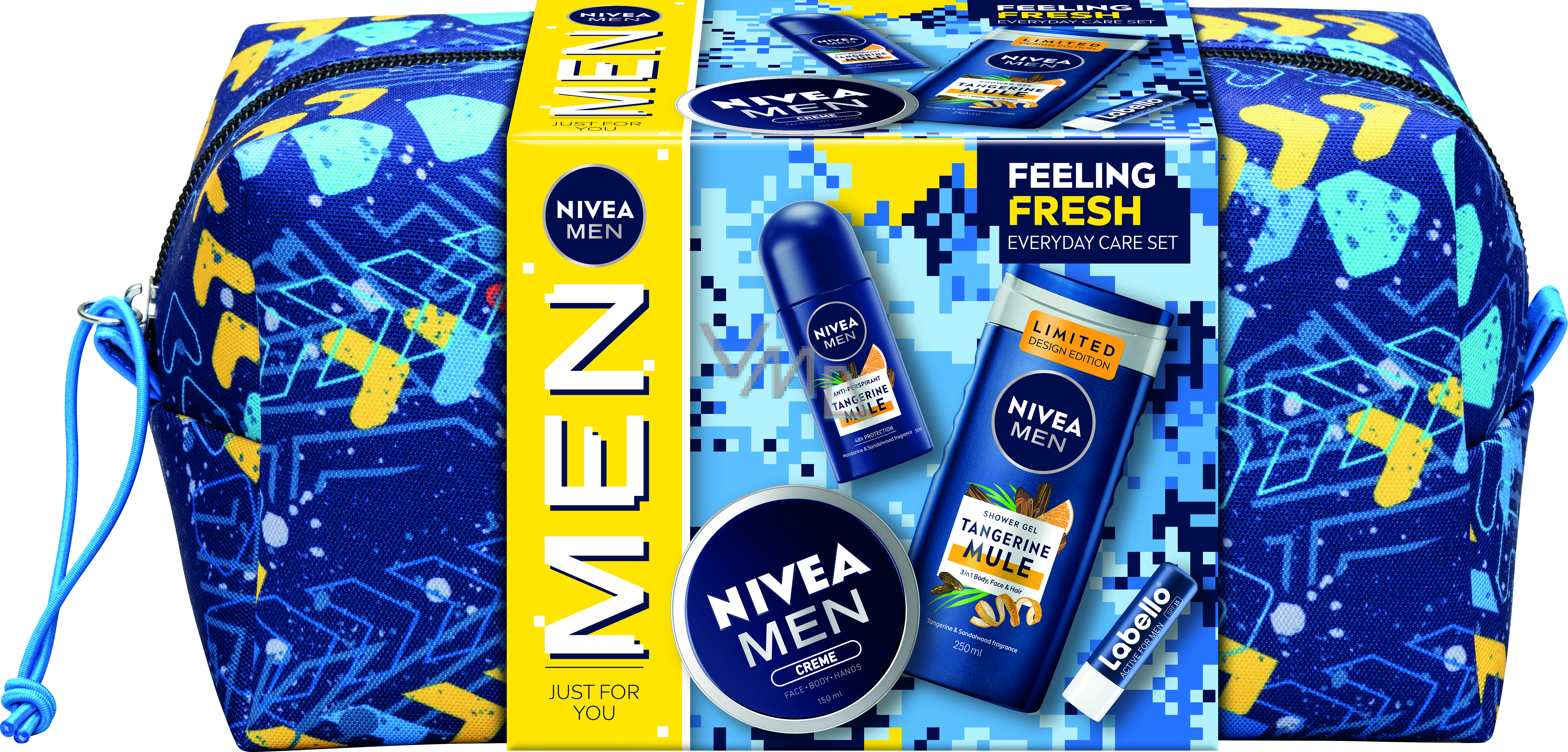 Nivea Men Feeling Fresh Tangerine Mule sprchový gel 250 ml + Tangerine Mule kuličkový antiperspirant roll-on 50 ml + Creme krém 150 ml + Labello for Men Active Care balzám na rty 4,8 g + kosmetická taška, kosmetická sada pro muže