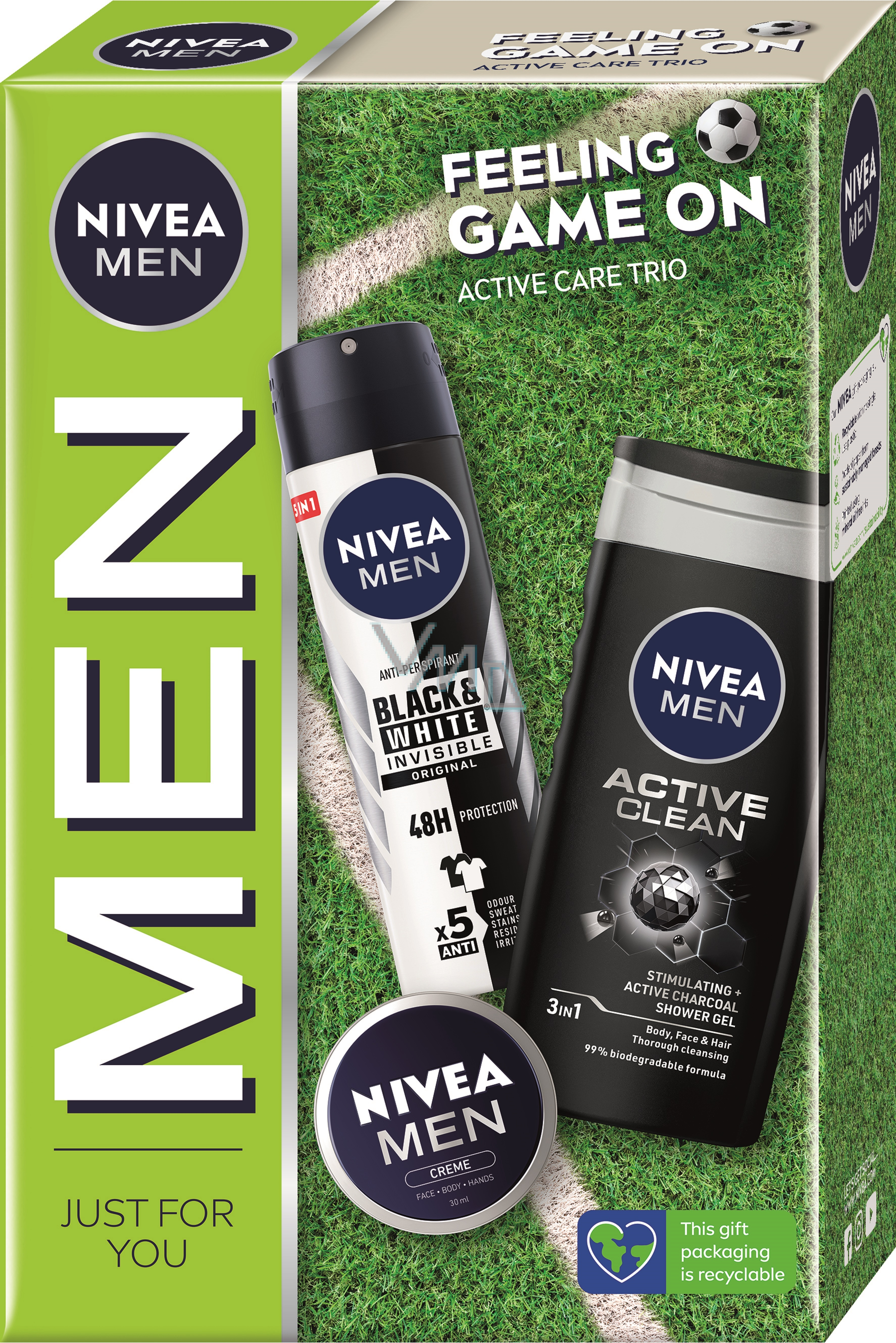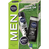 Nivea Men Feeling Game On Creme krém 30 ml + Active Clean sprchový gel 250 ml + Invisible Black & White antiperspirant deodorant sprej 150 ml, kosmetická sada pro muže