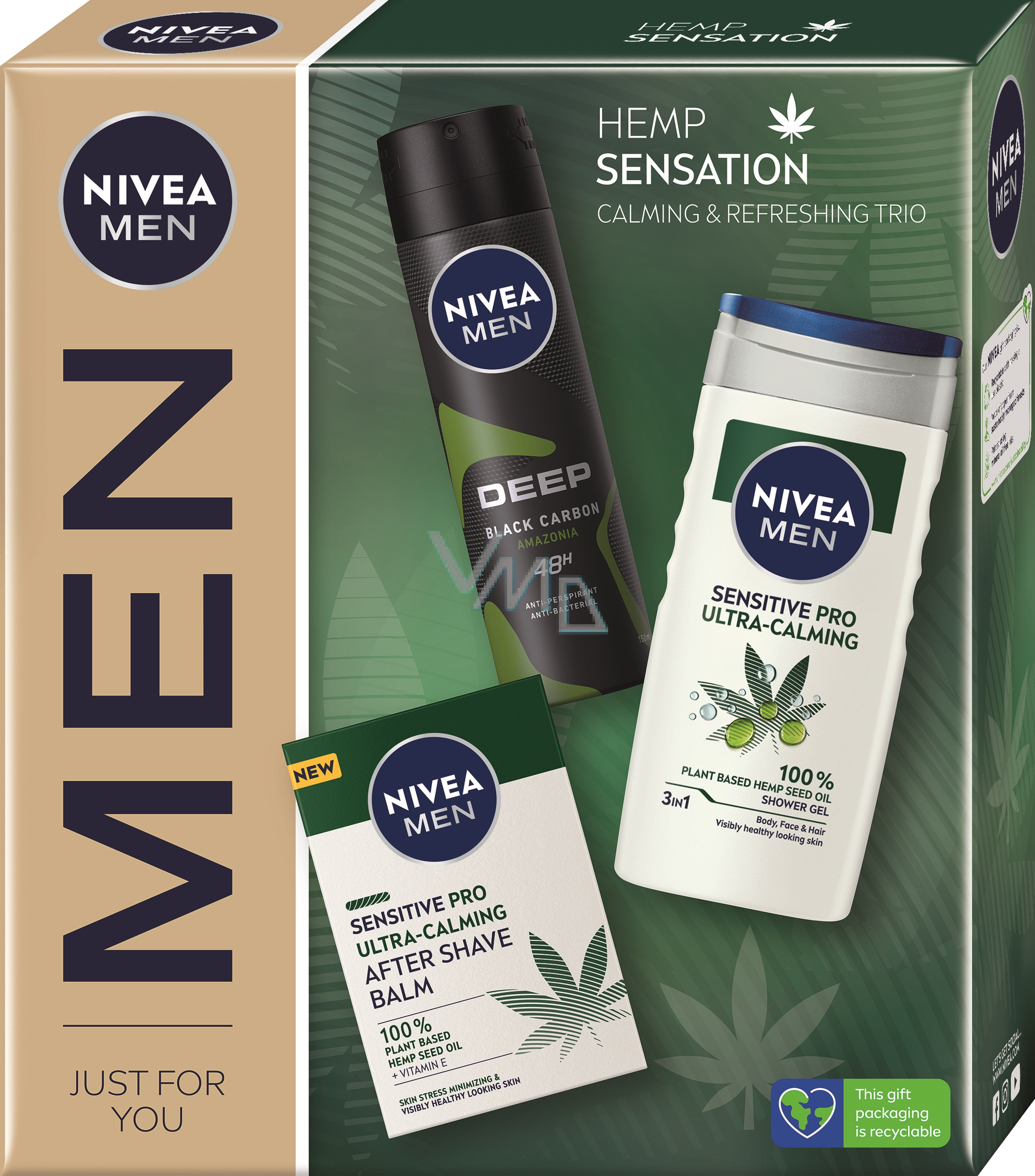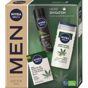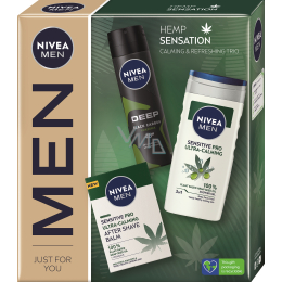Nivea Men Hemp Sensation Sensitive Pro balzám po holení s konopím 100 ml + Deep Black Carbon Amazonia antiperspirant sprej 150 ml + Sensitive Pro Ultra-Calming sprchový gel 250 ml, kosmetická sada pro muže