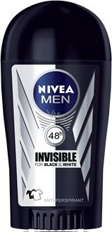 NIVEA Tuhý antiperspirant Invisible for Black & White Power s povzbuzující mužnou vůní poskytuje spolehlivou ochranu proti pocení bez bílých stop a žlutých skvrn na oblečení.