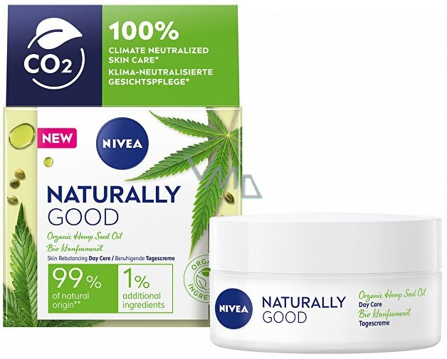Nivea Naturally Good zjemňující denní krém s 99 % ingrediencí přírodního původu. Vyvážené, příjemné složení obsahuje organický olej z konopných semínek a jojobový olej. 1% ingrediencí zajišťuje stabilitu a bezpečnost výrobku. Jeho veganské složení okamžitě zklidní a zjemní pleť, redukuje začervenání a zároveň sjednocuje tón pleti. Pro znatelně rozjasněnou a příjemně hebkou pleť!