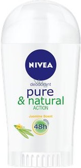 Nivea Pure & Natural Action s vůní jasmínu dámský tuhý deodorant obsahuje přírodně identické antibakteriální složky Bio-florine, které zajistí pokožce dlouhodobou ochranu. 48hodinová svěžest bez hliníkových solí a parabenů.