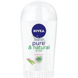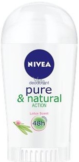 Nivea Pure & Natural Action s vůní lotosu dámský tuhý deodorant 48hodinová svěžest bez hliníkových solí a parabenů. Obsahuje přírodně identické antibakteriální složky Bio-florine, které zajistí pokožce dlouhodobou ochranu.