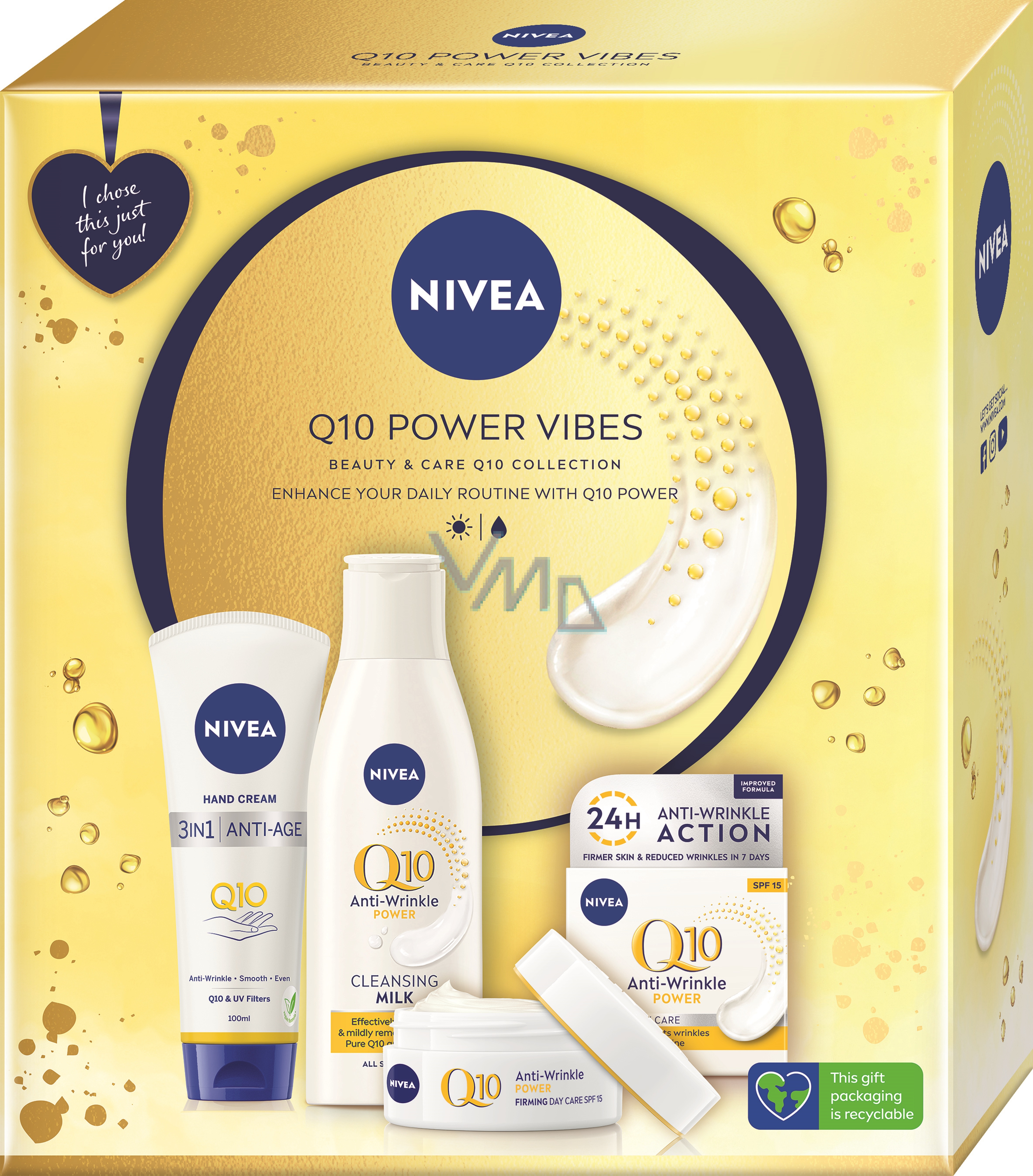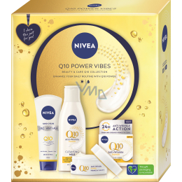 Nivea Q10 Power Vibes Q10 Anti-Age krém na ruce 100 ml + Q10 Power čisticí pleťové mléko proti vráskám 200 ml + Q10 Power denní krém proti vráskám 50 ml, kosmetická sada pro ženy