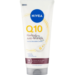 NIVEA Q10 ujędrniający krem do szyi i dekoltu, 200 ml, jest specjalnie opracowany do pielęgnacji delikatnej skóry tych wrażliwych partii. Zawiera czysty koenzym Q10, kreatynę i prowitaminę B5, które wspierają jędrność, elastyczność i nawilżenie skóry. Regularne stosowanie pomaga redukować drobne linie i zmarszczki, ujędrnia i wygładza skórę już po 14 dniach.