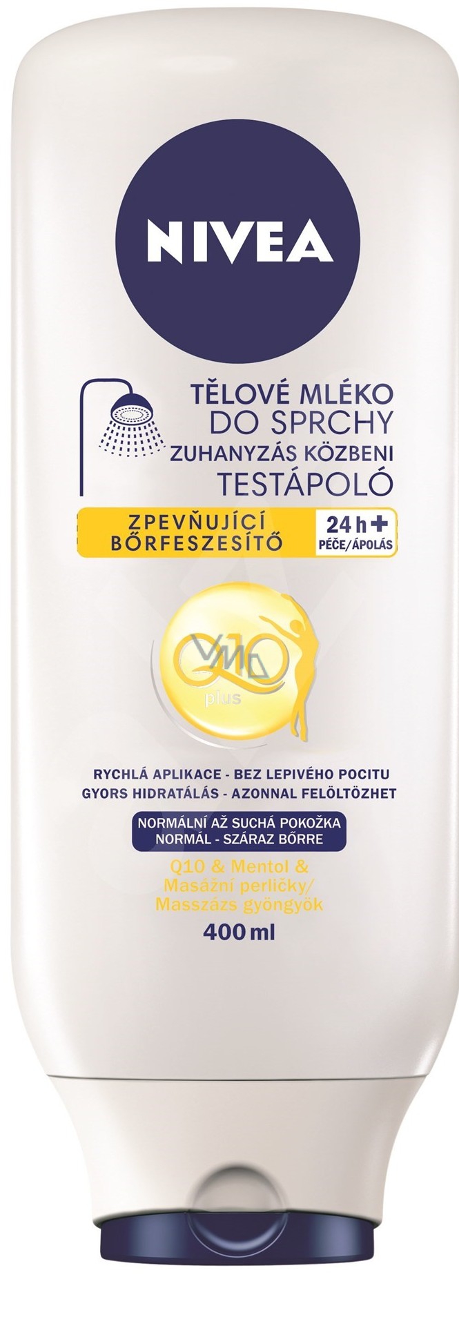 - Vmasírujte Nivea zpevňující tělové mléko do sprchy na vlhkou pokožku mimo proud vody. Účinné složení s koenzymem Q10 se okamžitě vstřebá a vy pocítíte, jak působí na vaši pokožku.