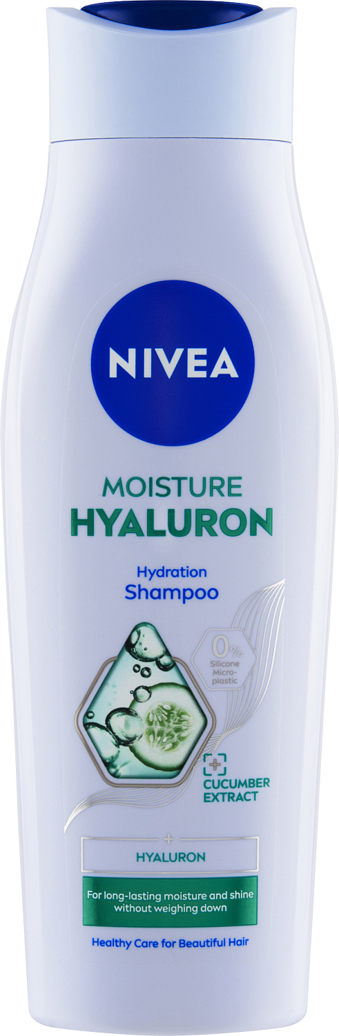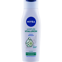 Nivea Nawilżający szampon Hyaluron z ekstraktem ogórkowym i kwasem hialuronowym dla natychmiastowego nawilżenia i przywrócenia blasku włosów.