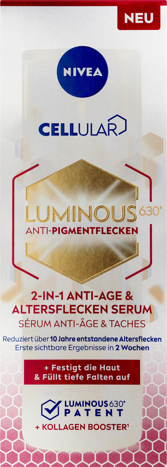Nivea przeciwstarzeniowe serum na plamy pigmentacyjne Cellular Luminous630. Specjalna formuła serum działa na poziomie komórkowym: Luminous630® redukuje i rozjaśnia ciemne plamy oraz zapobiega powstawaniu nowych. Kwas hialuronowy aktywuje komórki skóry**, wypełnia i intensywnie nawilża skórę.
