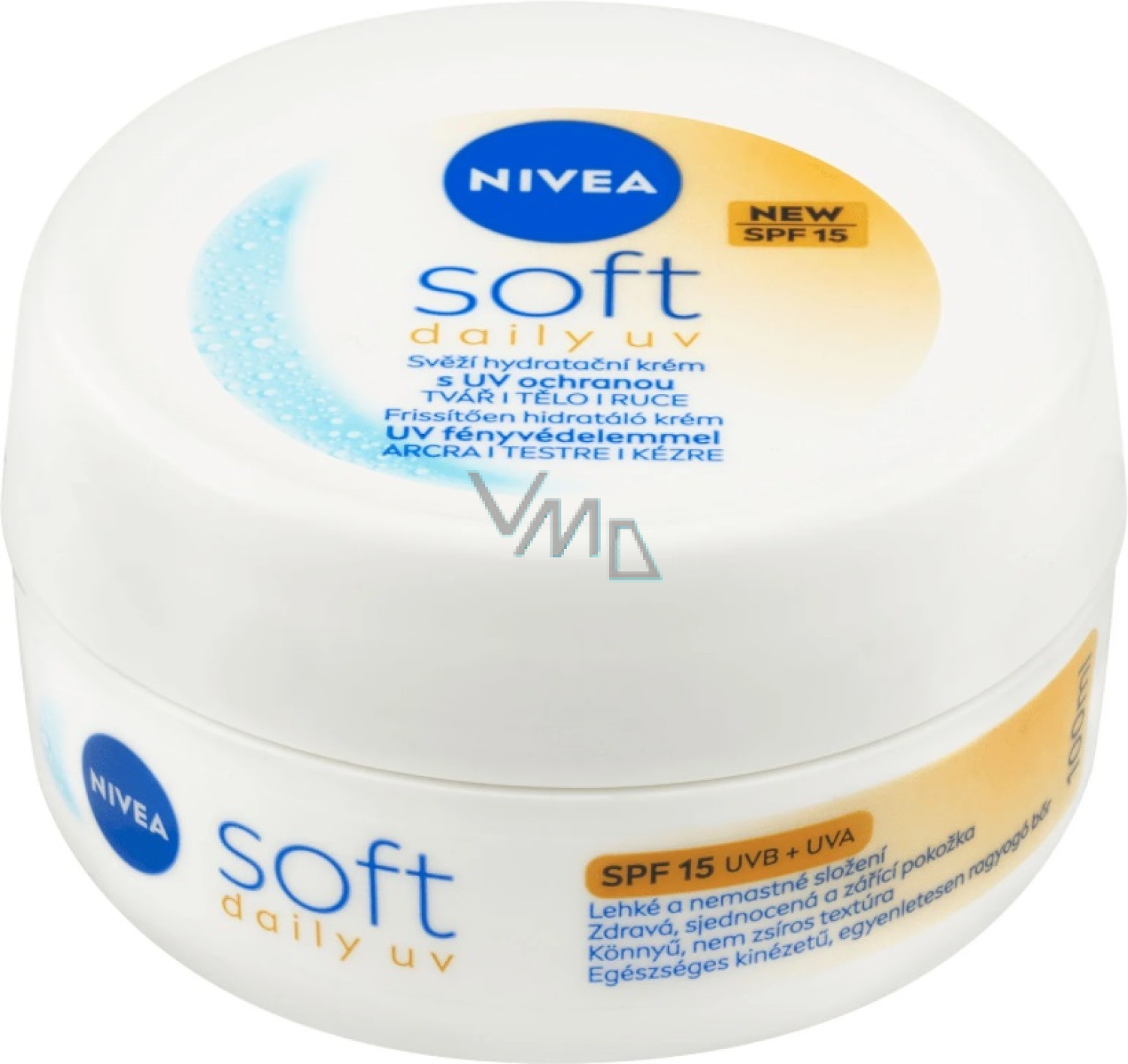 Nivea Soft Daily UV je lehký univerzální hydratační krém s SPF 15, určený pro každodenní péči o obličej, tělo a ruce. Kombinuje hlubokou hydrataci s ochranou před sluncem.
