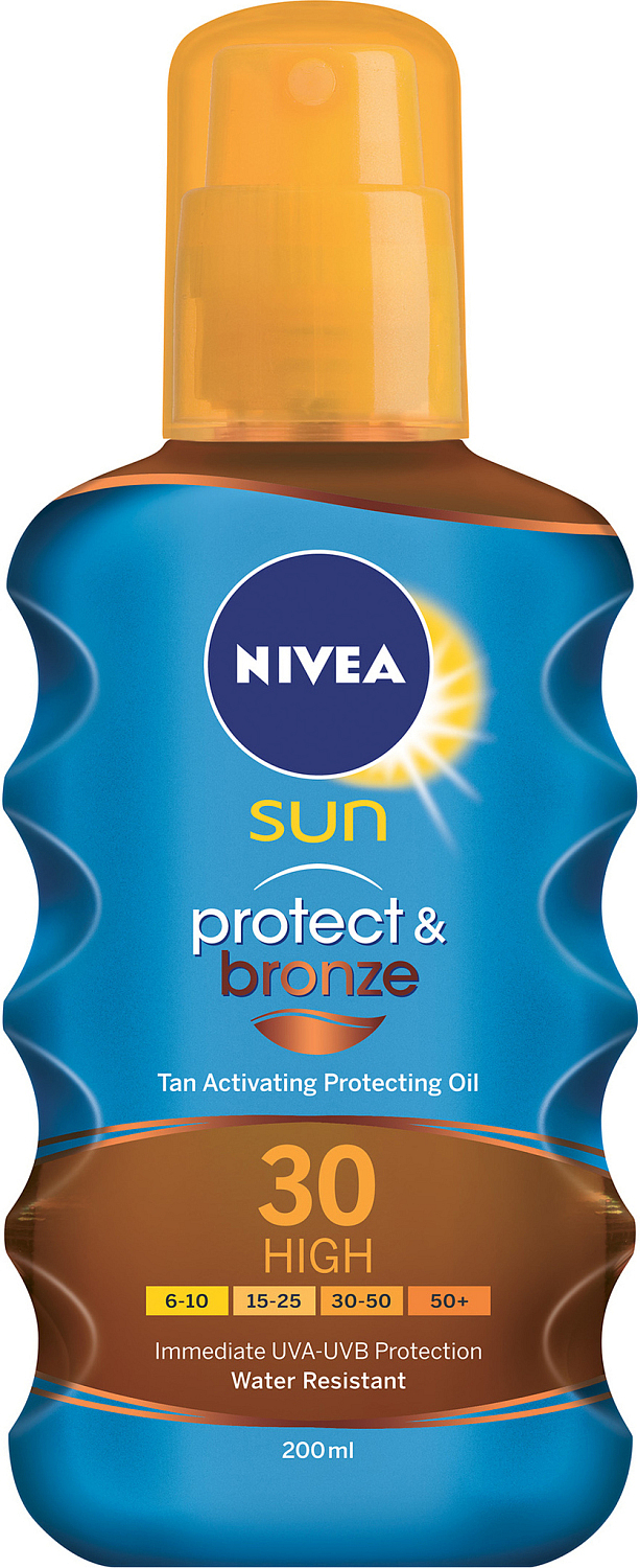 Podaruj sobie uczucie perfekcyjnie brązowej skóry. Bez oparzeń, bez podrażnień. Skład wodoodpornego oleju z połączeniem filtrów UVA i UVB zapewnia niezawodną ochronę natychmiast po nałożeniu. Naturalne ekstrakty roślinne wspierają produkcję melaniny, która przy regularnej aplikacji przyczynia się do opalenizny skóry. Dzięki nowemu składowi plamy po środkach przeciwopaleniowych po praniu są mniej widoczne. Zapomnij o samoopalających mleczkach - NIVEA Olej do opalania w sprayu wspierający opaleniznę OF 30.