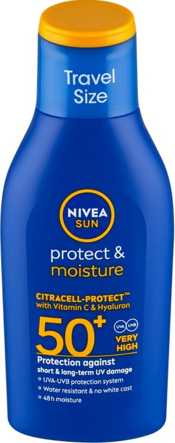 Nawilżające mleczko do ciała Nivea Sun Protect & Moisture z bardzo wysokim faktorem ochronnym SPF 50+ chroni skórę przed szkodliwym promieniowaniem UVA i UVB. Dzięki technologii Citracell Protect™ oraz obecności witaminy C i kwasu hialuronowego zapewnia intensywne nawilżenie aż do 48 godzin. Mleczko ma lekką konsystencję, która łatwo się rozprowadza, szybko się wchłania i nie pozostawia białych śladów. Jest wodoodporne i odpowiednie dla wszystkich typów skóry. Opakowanie wykonano głównie z materiałów pochodzących z recyklingu.