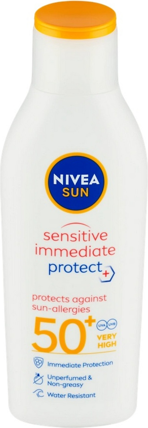 Mleko do opalování Nivea Sun Sensitive Immediate Protect OF50+ jest specjalnie opracowane dla wrażliwej skóry, która potrzebuje wysokiej ochrony przed promieniowaniem słonecznym. Zapewnia natychmiastową ochronę przed promieniami UVA i UVB oraz pomaga zapobiegać poparzeniom i przedwczesnemu starzeniu się skóry. Lekkie i nietłuste składniki szybko się wchłaniają, nie pozostawiają białego filmu i zawierają składniki nawilżające, które utrzymują skórę elastyczną i ukojoną podczas pobytu na słońcu.