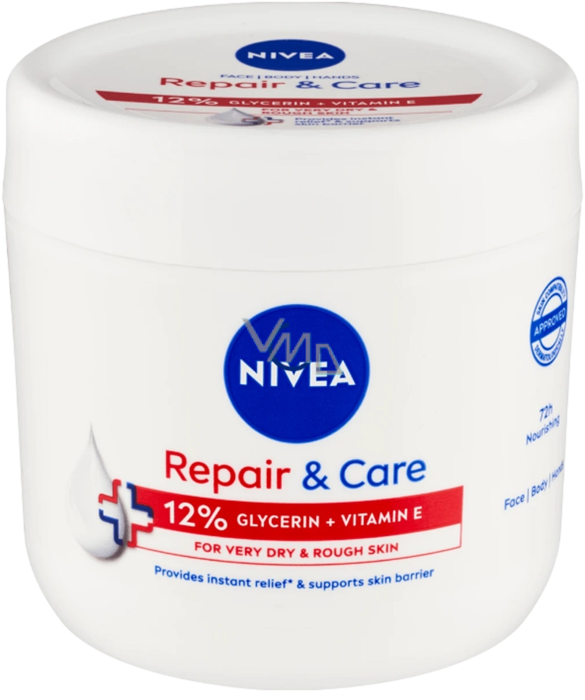 Nivea Repair & Care krem do ciała jest odpowiedni do ciała, twarzy i rąk. Dzięki zawartości 12 % glicerolu i witaminy E zapewnia dodatkową pielęgnację i 72 h nawilżenia. Ten krem natychmiast łagodzi bardzo suche i szorstkie skóry, a jednocześnie wspiera barierę skórną. Przestań się męczyć z suchą skórą i zacznij cieszyć się uczuciem nawilżenia i pielęgnacji z kremem do ciała zapewniającym kompleksową pielęgnację Twojej skóry. Z kremem do ciała Repair & Care od marki NIVEA będziesz mieć zdrową, nawilżoną i gładką skórę przez cały dzień.