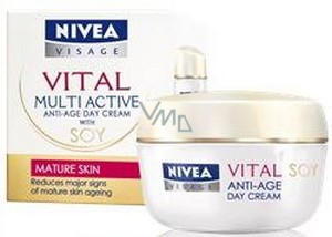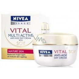 Nivea Visage Vital denní krém proti vráskám Multi Active Sója pro zralou pleť redukuje hlavní známky stárnutí pleti. Složení s přírodními sójovými výtažky pomáhá podporovat pleti vlastní produkci kolagenu a zvyšovat úroveň kyseliny hyaluronové v pleti.