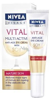 Nivea Visage Vital oční krém proti vráskám Multi Active Sója pro zralou pleť redukuje hlavní známky stárnutí citlivé oblasti kolem očí. Složení bez parfému s přírodními sójovými výtažky.