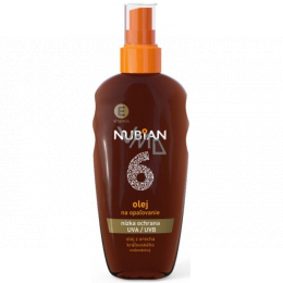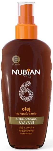 Olej na opalování Nubian OF 6 - nízká ochrana s kombinací UVA / UVB filtrů chrání pokožku před slunečním zářením. Snadno a rychle se aplikuje. Chraňte svou pokožku při opalování a získejte zlatavý odstín opálení s olejem na opalování Nubian SPF 6.