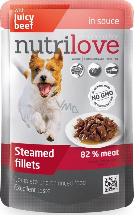 Nutrilove dušené filetky – je kompletní a vyvážené krmivo pro psy vysoké kvality, které může být podáváno také jako chutná pochoutka nebo odměna. Váš pes si vychutná skvělou chuť bez přidaných umělých aromat a bez přidaných konzervantů. Vše co Váš pes potřebuje.