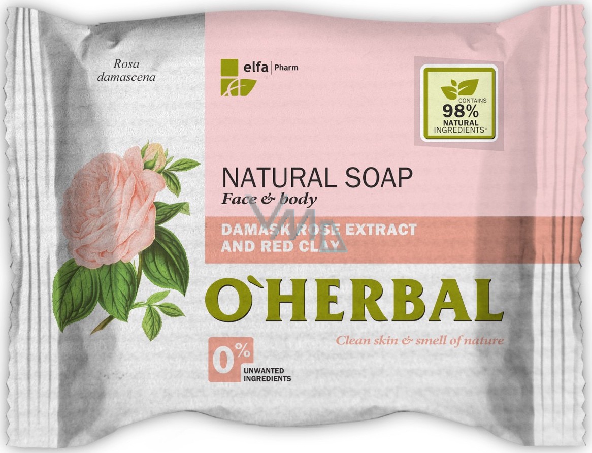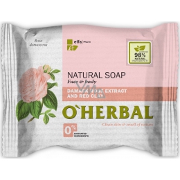 Jedinečné přírodní mýdlo O Herbal s extraktem Damašková růže a červené hlíny s vysokým obsahem přírodních složek až 98%. Pokožku nevysušuje a zanechává ji čistou a hladkou. Pro všechny typy pleti. Příjemná a svěží vůně Vám dodá pocit čistoty a svěžesti.