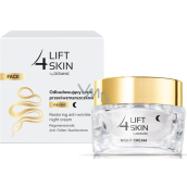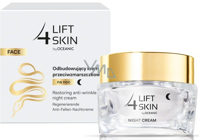 LIFT4SKIN je revoluční řada intenzivní kosmetiky snižující vrásky. Obnovující noční krém proti vráskám stimuluje obnovu buněk a zajišťuje vícerozměrný lifting. Inovativní složka - SYN®-AKE - biomimetický tripeptid, která působí jako toxiny v hadím jedu, zpomaluje svalové kontrakce a zabraňuje tvorbě nových vrásek. Kombinace neuropeptidu a drahých olejů zajišťuje proaktivní opravu. Intenzivně regeneruje a posiluje pokožku během spánku, díky čemuž je hedvábně hladká, pevná a pevná.