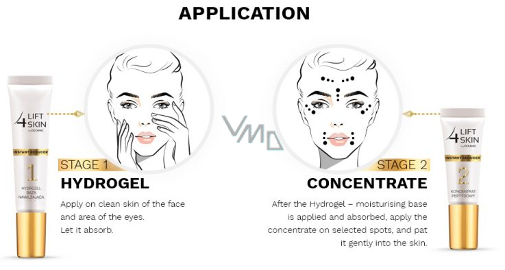 Peptidový koncentrát je druhým stupněm okamžité a intenzivní korekce problematických oblastí. Již po 2 minutách po aplikaci redukuje hluboké brázdy a váčky pod očima a také rozjasňuje stíny pod očima a poskytuje efekt fenomenální hladkosti pokožky a vyplnění vrásek.