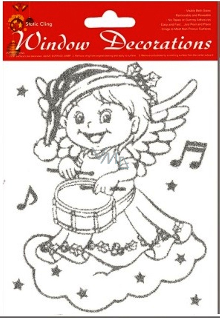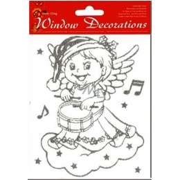 Okenní fólie bez lepidla andílci se stříbrnými glitry s bubnem 18 x 15 cm
