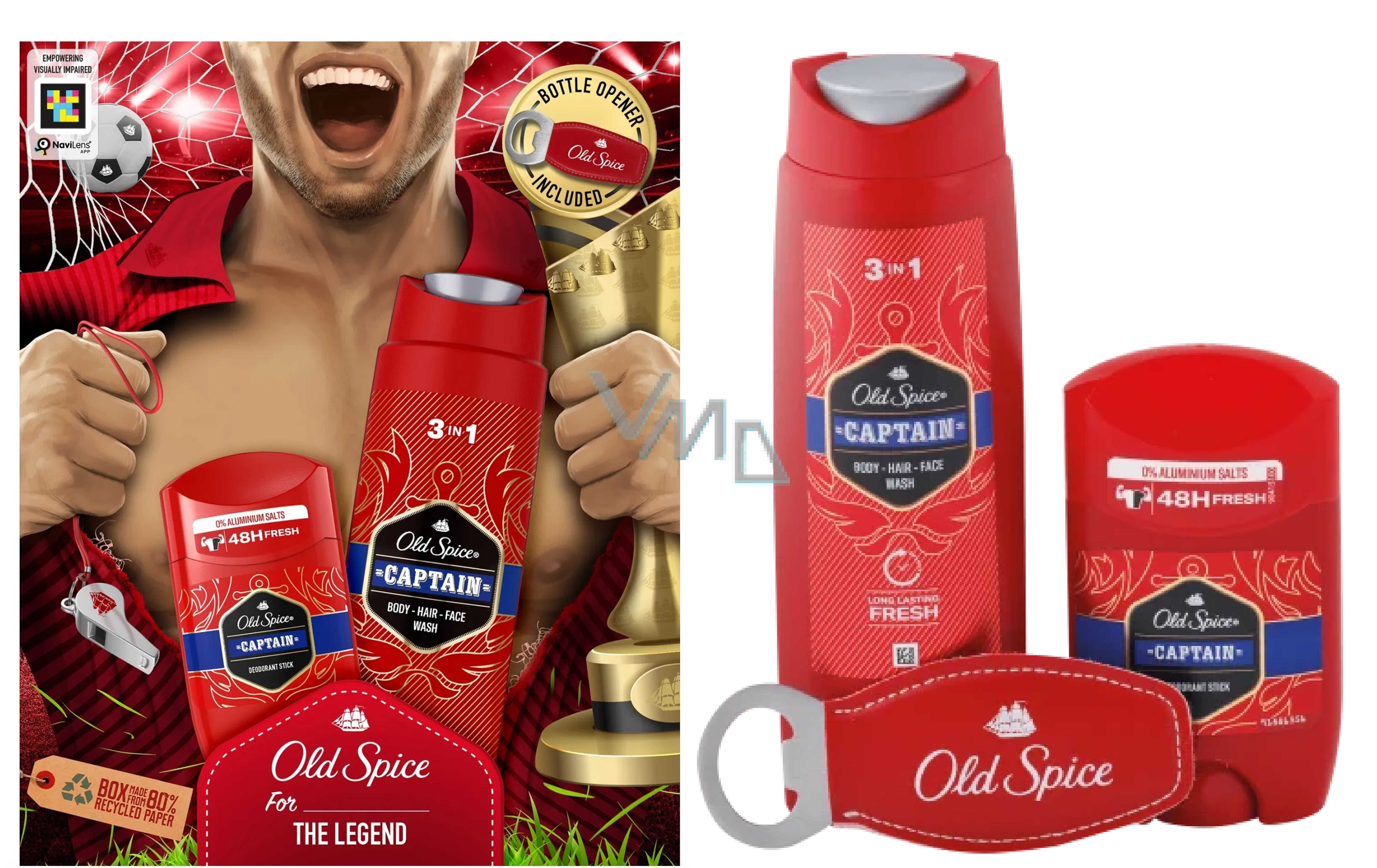 Z nieodpartym męskim zapachem Old Spice nie można się pomylić. Zestaw prezentowy Footballer od Old Spice zawiera dezodorant w sztyfcie, żel pod prysznic Captain i otwieracz do butelek. Zawartość jest zapakowana w kartonowe pudełko z wzorem Footballer, które jest idealne dla wszystkich miłośników piłki nożnej w Twoim życiu. Produkty w zestawie prezentowym Footballer mają zapach Captain z nutami wody i cytrusów. Ten nowoczesny męski zapach należy do naszych bestsellerów, więc nie możesz się pomylić.