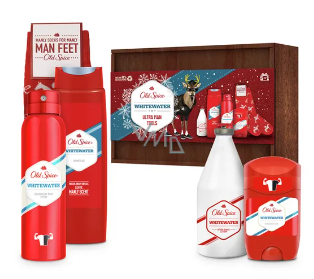 Old Spice v nádherné a praktické dárkové sadě je skvělou volbou pro všechny muže, kteří chtějí ukázat svou dominanci a sílu. Obalte se mužnou vůní sprchového gelu, bojujte proti potu s deodoranty a zklidněte podrážděnou pokožku s vodou po holení. Sada také obsahuje stylové vánoční ponožky do chladných zimních večerů. Se sadou Old Spice White Water Wooden 5v1 nemůžete sáhnout vedle.