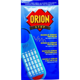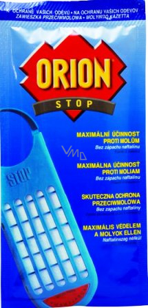Orion Stop molům je přípravek proti molům šatním, který po dobu 6-ti měsíců chrání oděvy (svetry, kabáty, deky, kožešiny, koberce atd) tím, že hubí moly všech vývojových fází. Zároveň zanechává ve skříních příjemnou vůni.