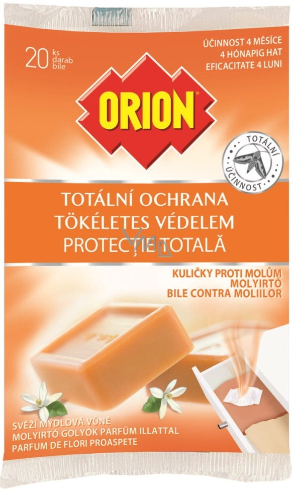 Orion Totální ochrana kuličky proti molům jsou insekticidní přípravky, které zabíjí šatní moly po dobu 4 měsíců. Každá kulička je balena jednotlivě, proto nedochází k ušpinění oděvů nebo rukou. Jedna kulička ochrání prostor cca 0,07 m3.