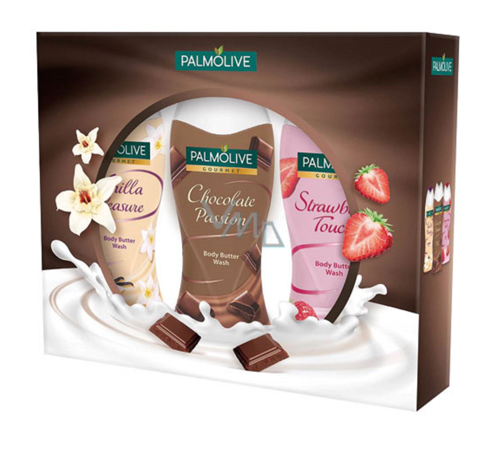 Dárková sada Palmolive Gourmet Triple obsahuje 3× sprchový gel určený pro péči o dámskou pokožku. Sprchové gely z řady Gourmet svým bohatě krémovým složením zahalí pokožku do sametové textury pro perfektní hydrataci a očistu celého těla, kterou doprovází smyslná vůně vanilky, gurmánské čokolády nebo lahodné jahodové potěšení.