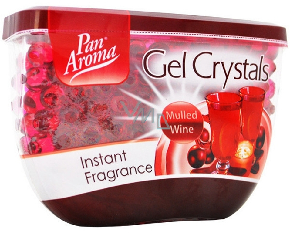 Osvěžovač vzduchu Pan Aroma obsahuje malé gelové kuličky, které provoní Váš domov vůní svařeného vína. Příjemná vůně Vám vydrží po dlouhý čas. Vonný gel ve formě dvoubarevných parfémovaných kuliček, elegantní osvěžovač (plastová nádobka). Gelové kuličky uvolňují vůni postupně, osvěžovač vydrží několik týdnů. Jemná, decentní vůně neutralizuje nepříjemné pachy, vhodné zejména do menších místností, například na WC, do koupelny apod.
