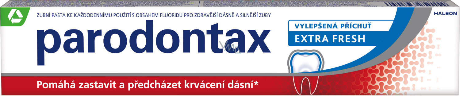Pasta do zębów parodontax Extra Fresh pomaga zatrzymać i zapobiegać krwawieniu dziąseł, a jednocześnie utrzymuje w ustach uczucie czystości i świeżości przez wiele godzin. Pasty do zębów parodontax (z wyjątkiem pasty parodontax Classic) zawierają 1400 ppm fluoru, który pomaga zapobiegać próchnicy, sodę oczyszczoną, która pomaga usunąć płytkę nazębną i utrzymać usta w czystości, oraz mieszankę ekstraktów roślinnych, które nadają jej unikalny smak. Na smak pasty może zająć chwilę przyzwyczajenia, ale większość ludzi szybko ją polubi, tak jak zwykłe pasty do zębów. Z pewnością polubisz uczucie czystości, które zapewniają. Codzienne stosowanie pasty parodontax pozwoli Ci utrzymać zdrowe dziąsła, mocne zęby i świeży oddech.