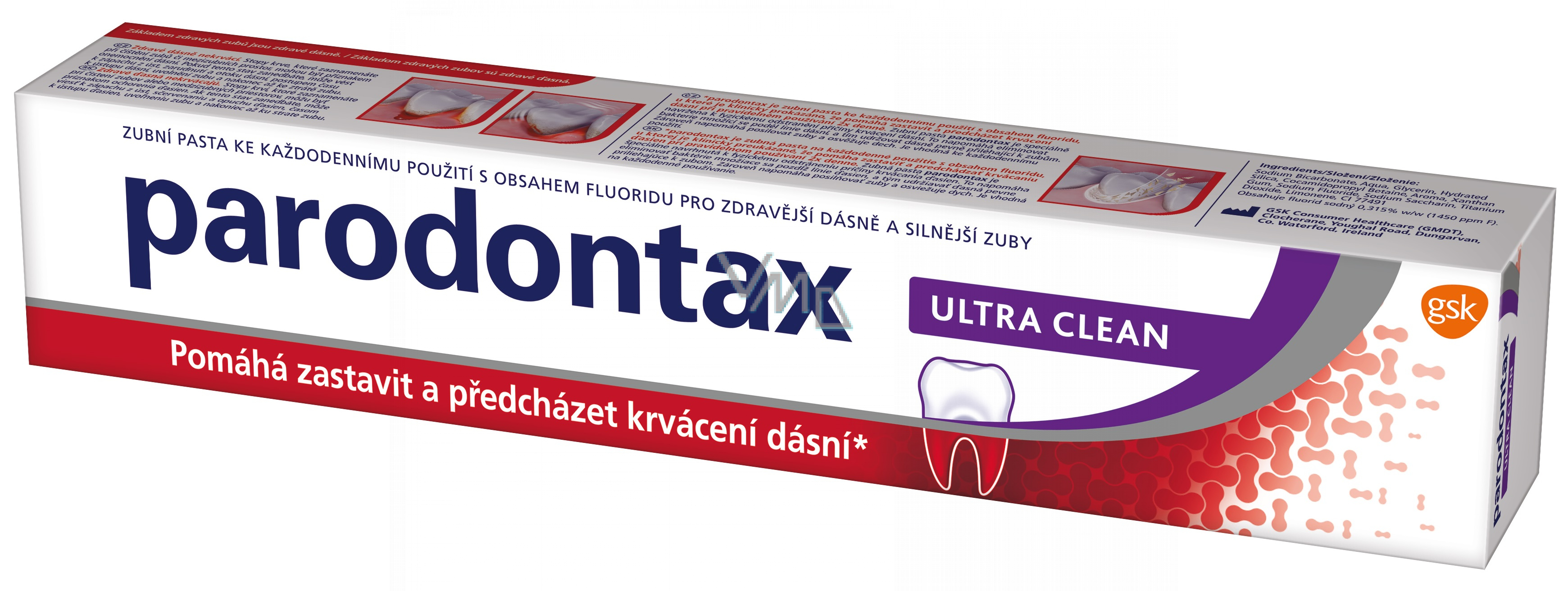 Używaj pasty do zębów Parodontax codziennie, aby usunąć płytkę i pomóc w przywróceniu i utrzymaniu zdrowia swoich dziąseł. Zawiera również fluor. Parodontax Ultra Clean usuwa więcej płytki niż zwykła pasta do zębów i zostawia uczucie ultra czystych i świeżych ust. Po 14 dniach stosowania pasty do zębów Parodontax większość ludzi polubiła jej unikalny smak.