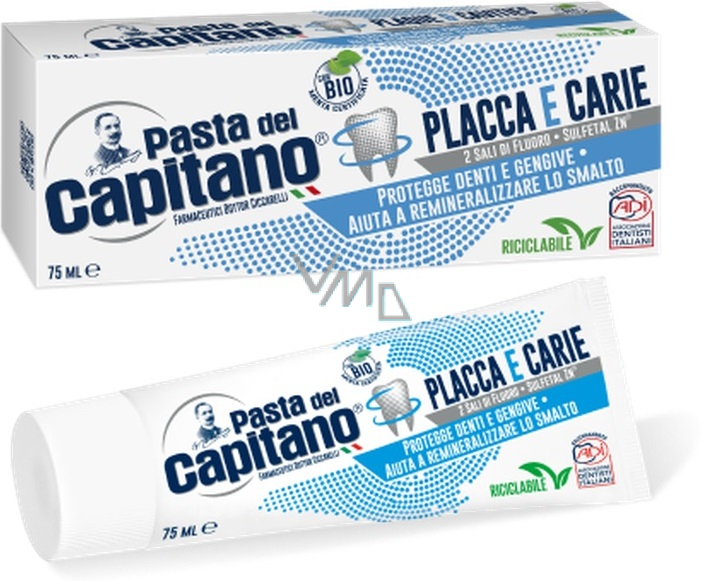 Linia Pasta del Capitano oferuje zawsze sprawdzone, skuteczne i klinicznie przetestowane produkty do higieny jamy ustnej. Pasta do zębów Pasta del Capitano PLACCE E CARIE z certyfikowaną BIO miętą skutecznie chroni zęby i dziąsła. Dzięki obecności 2 soli fluorkowych pomaga neutralizować kwasy obecne na szkliwie i jest skuteczna przeciwko płytce nazębnej i próchnicy. Dzięki cynkowi działa przeciwbakteryjnie. Skład z ekskluzywną cząsteczką Sulfetal Zn® gwarantuje kompleksową higienę jamy ustnej. Rezultatem jest głębokie oczyszczenie jamy ustnej i skuteczna profilaktyka przeciwko płytce nazębnej i próchnicy.