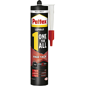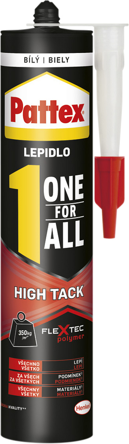 Jednoskładnikowy biały uniwersalny klej montażowy Pattex ONE FOR ALL HIGH TACK można stosować zarówno wewnątrz, jak i na zewnątrz. Jego opatentowana receptura FlexTec gwarantuje wysoką elastyczność i wytrzymałość połączenia nawet w najbardziej wymagających warunkach. Przy klejeniu nie spływa, nie opada, tłumi dźwięki i wibracje oraz klei szeroką gamę materiałów chłonnych i niechłonnych. Utwardza się pod wpływem wilgoci z powietrza, korekcja połączenia jest możliwa jeszcze przez kilka minut po sklejeniu. Po utwardzeniu można go malować i szlifować, nie zawiera izocyjanianów i rozpuszczalników, może być stosowany na wilgotnych podłożach. PATTEX ONE FOR ALL HIGH TACK - najsilniejszy klej montażowy na bazie polimeru FlexTec.