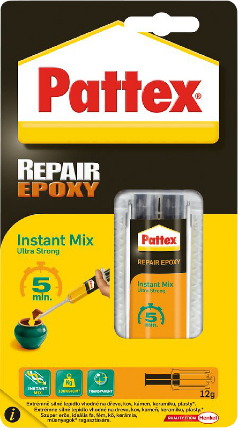 Pattex Repair Epoxy Ultra Strong 5 min to dwuskładnikowy klej epoksydowy bez lotnych rozpuszczalników, uniwersalnie przydatny. Przeznaczony do klejenia, napraw i mocowania niemal wszystkich materiałów: drewno, metal, szkło, ceramika, guma, kamień, beton, marmur i większość tworzyw sztucznych. Nie zaleca się klejenia PP, PE, PTFE (Teflon®) i polistyrenu.