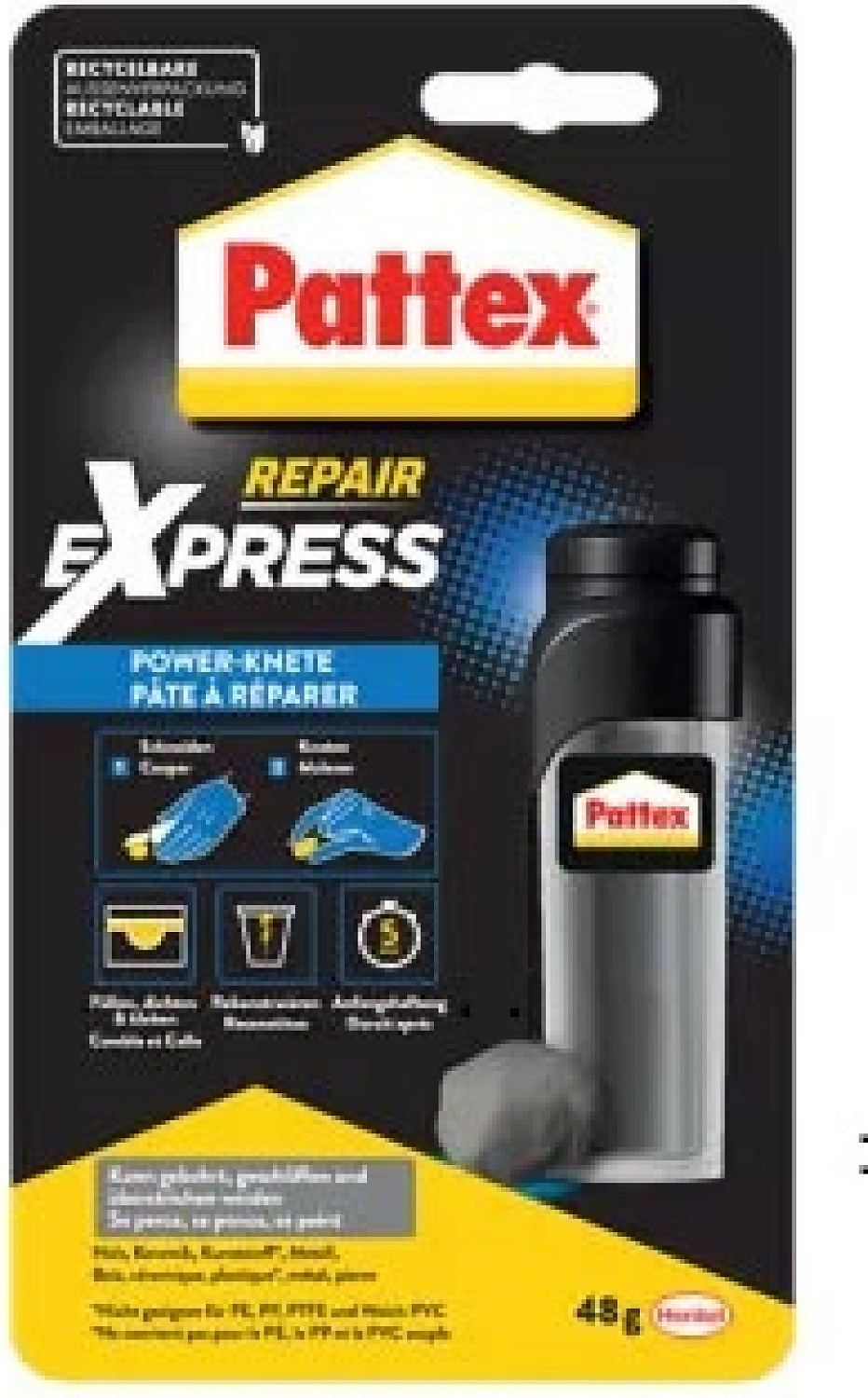 Pattex Repair Express Metal jest dwu składnikowym klejem epoksydowym zaprojektowanym do szybkich i trwałych napraw w domu i warsztacie. Dzięki swojemu metalicznemu kolorowi i wysokiej odporności jest idealny do klejenia, modelowania i wypełniania różnych materiałów. Po utwardzeniu masa jest poddawana obróbce mechanicznej, odporna na warunki atmosferyczne, środki czyszczące, rozpuszczalniki i wodę.